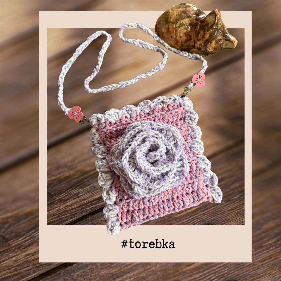 Torebka szydełkowa z różą – różowo-fioletowa
